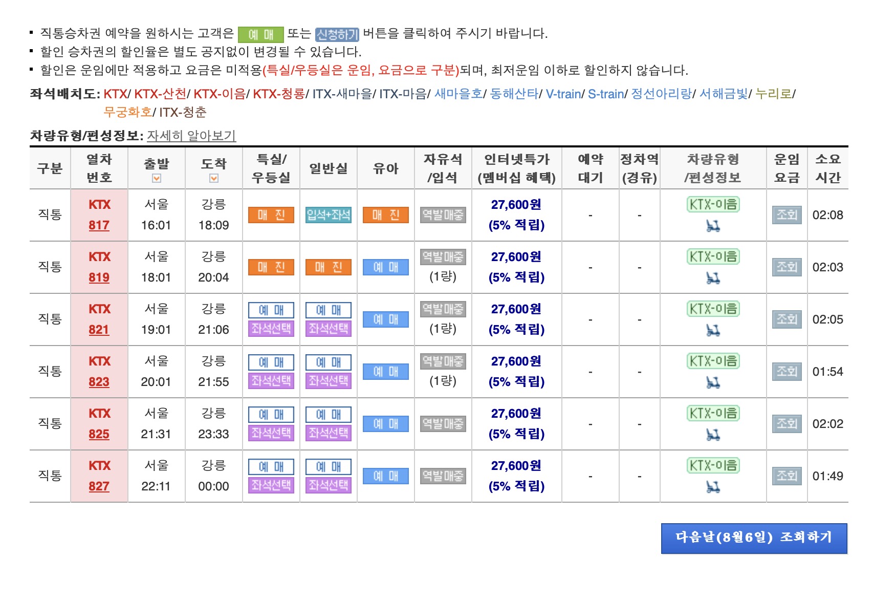 - 서울에서 강릉까지의 KTX 예약 페이지로 이동합니다.